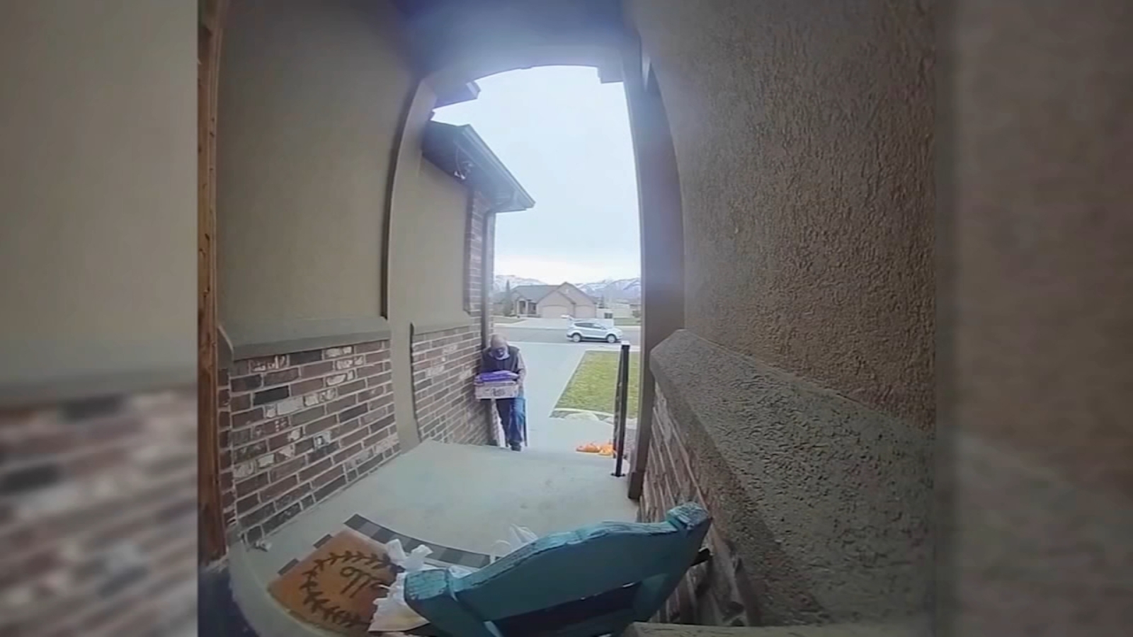 Her video doorbell camera captured the delivery man leaning, seemingly unable to stand- although he managed to deliver her package.