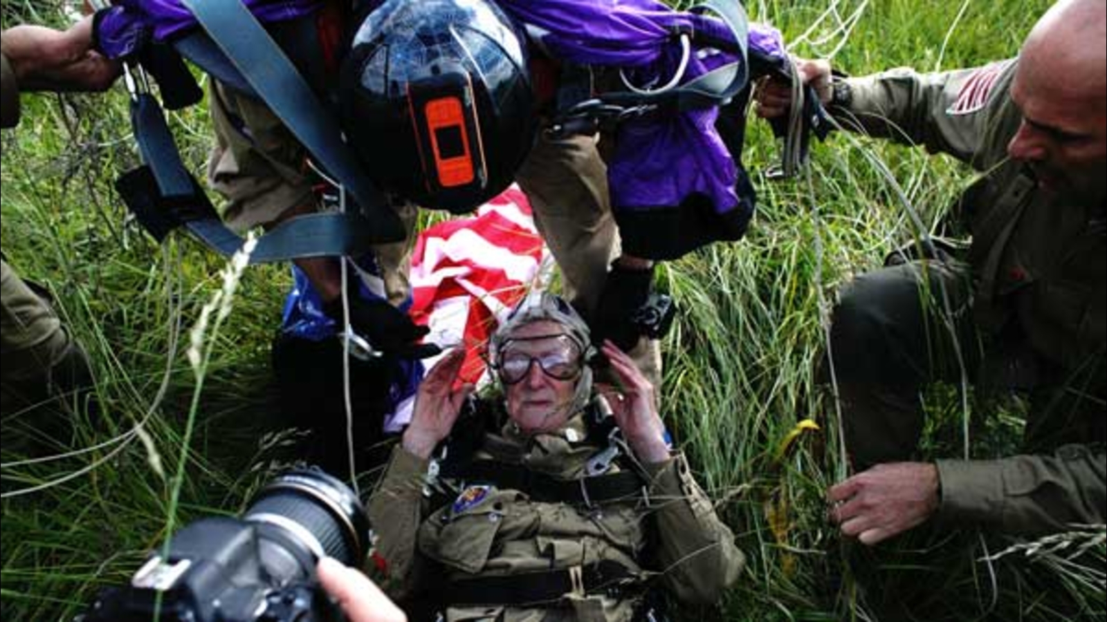 In the '44 jump, he dropped 500 feet and landed before dawn in the rain. His job afterwards was to head off any German soldiers who tried to stop the Allies from liberating Ranville.