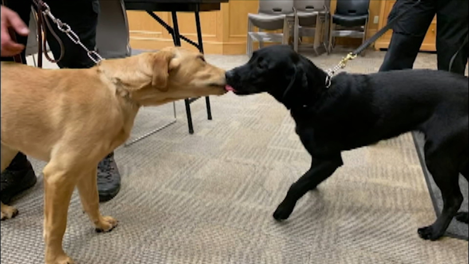 The 9-month-old Labradors are stepsiblings and work for the Bristol County Sheriff's Office.