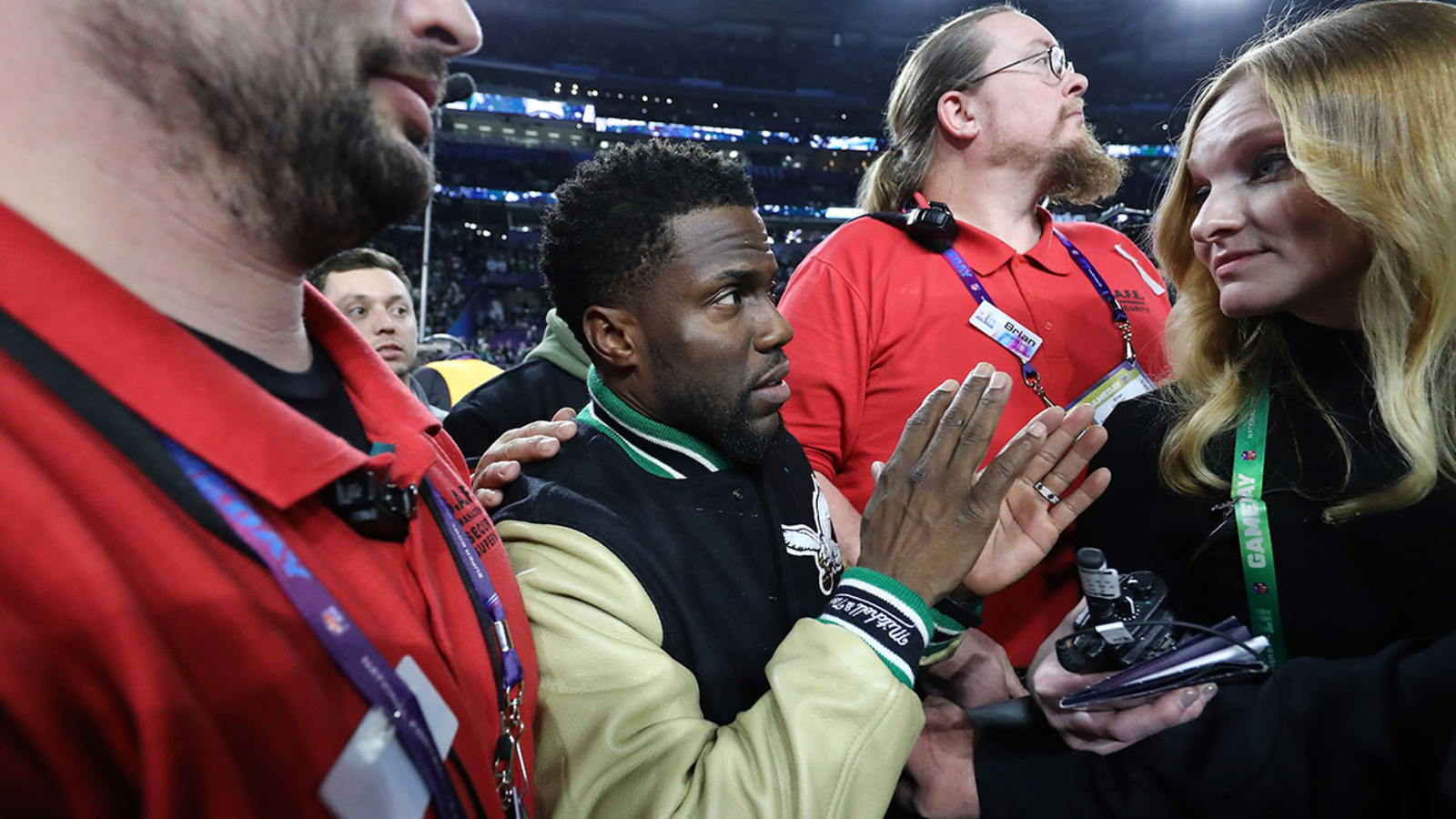 After the Eagles pulled off their Super Bowl win, comedian and Philadelphia native Kevin Hart was on the field and just wanted to fly onto the stage with the team.