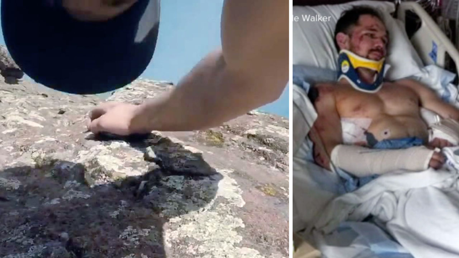 A GoPro camera strapped to his chest captured the fall, which Walker estimated was about 60 feet. It continued to roll as he tumbled down the rock face to a painful landing and then showed him moaning as he drifted in and out of consciousness.