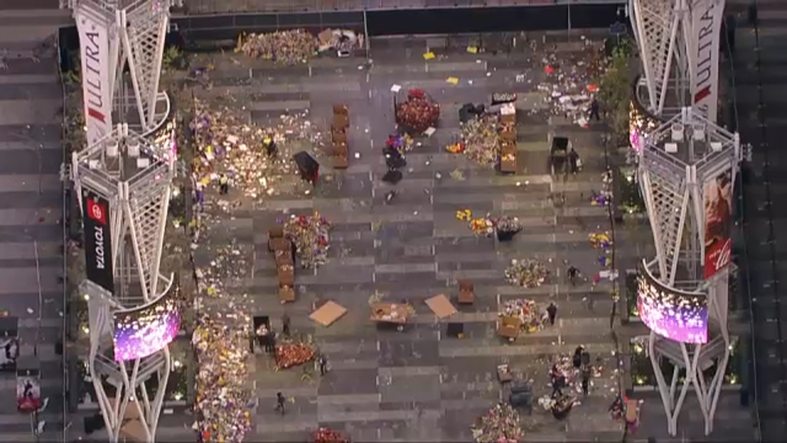 DOWNTOWN LOS ANGELES -- Just over a week after NBA superstar Kobe Bryant and eight others were killed in a helicopter crash, crews on Monday began taking down the sea of purple and gold left by fans outside Staples Center.