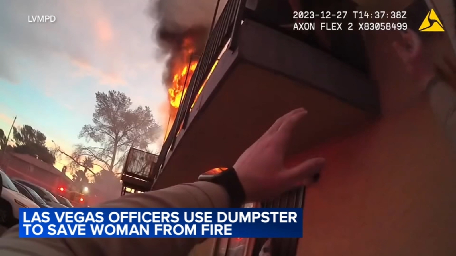 One of the officers climbed onto a dumpster to rescue a woman trapped on the burning building's second floor.