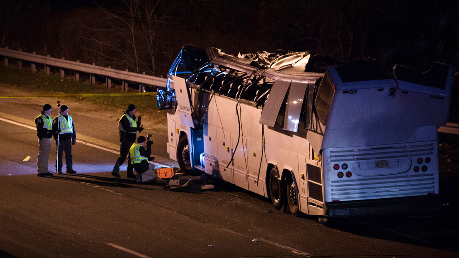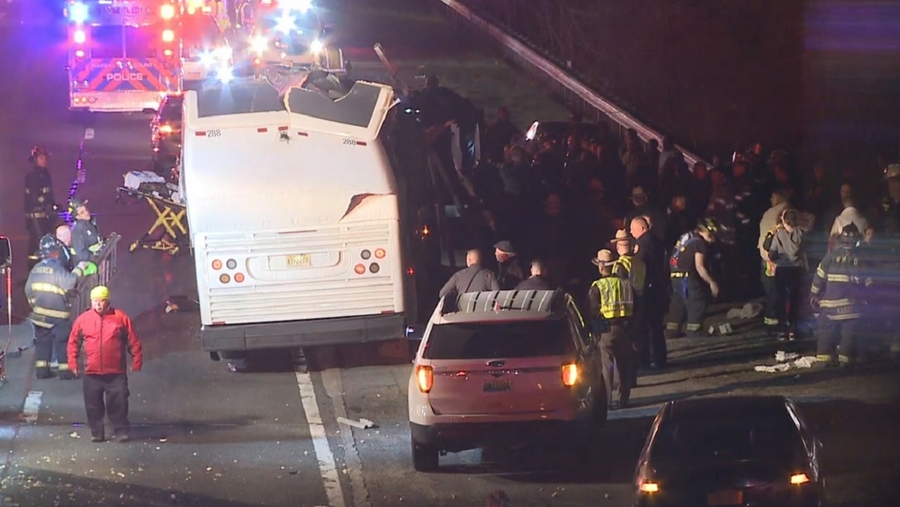 The commercial bus from Journey Bus Tours was traveling eastbound from JFK Airport. Authorities say 38 students from various Long Island schools, five chaperones, and one driver were returning from a trip to eastern Europe.