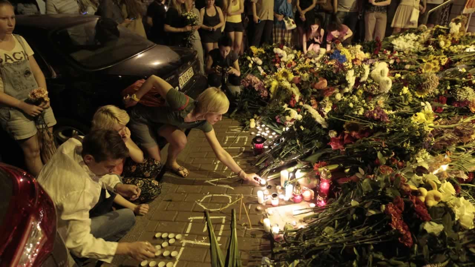 A man lays flowers in front of restaurant Asian Glories in Rotterdam, Saturday, July 19, 2014. (AP Photo/Phil Nijhuis)