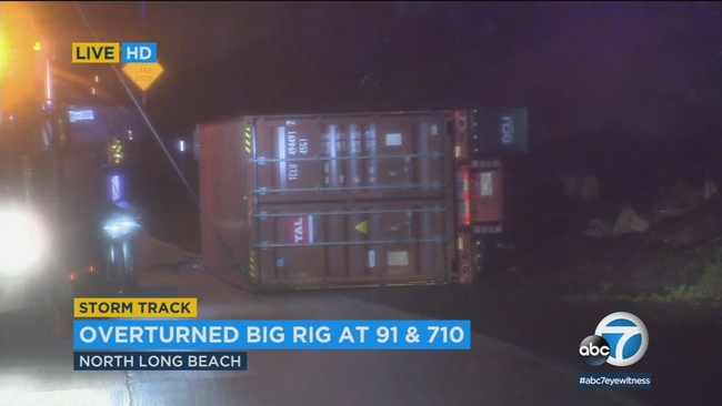 In North Long Beach, a big rig overturned on the westbound 91 Freeway transition to the southbound 710 in around 3:30 a.m.