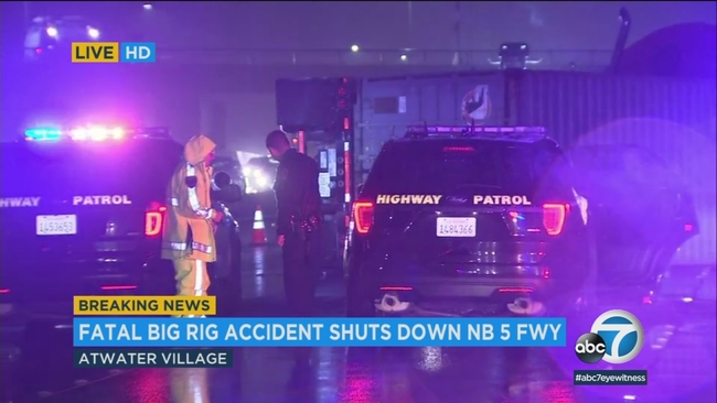 In the Atwater Village area, a fatal crash involving a big rig shut down all lanes of the northbound 5 Freeway amid slick roads.