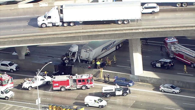 Earlier, north of Sun Valley, a big rig drove off the northbound 5 Freeway connector to the westbound 118 Freeway, landing on the roadway below. In addition to the big rig, multiple other vehicles were also involved in the wreck. There were no immediate reports of injuries.