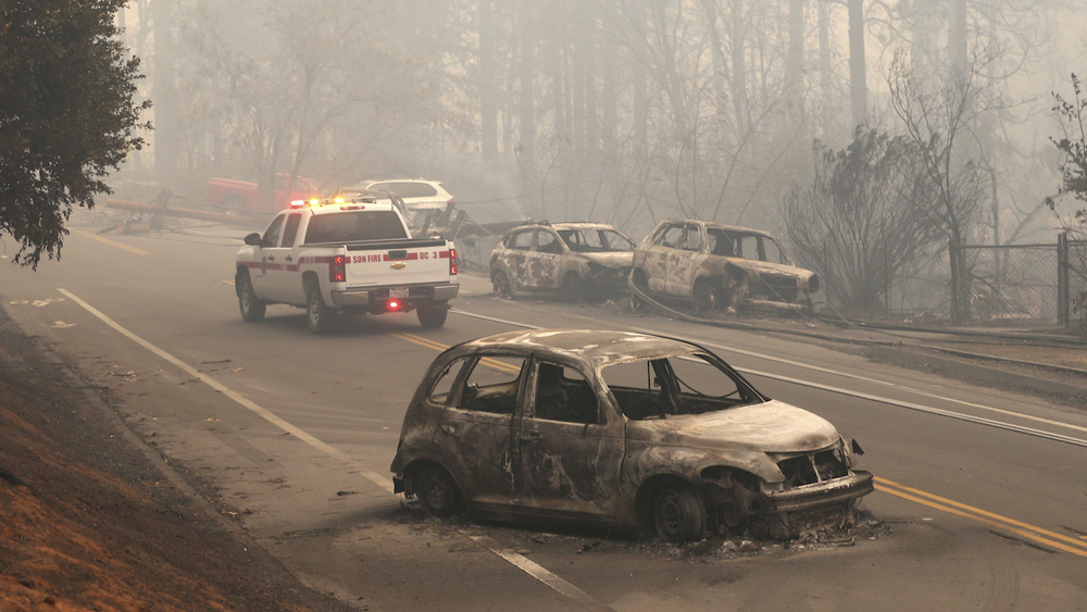 Abandoned cars line roadways. There are trucks and even a school bus among them. Some ran off the road or smashed into one another as drivers tried to escape the wall of flames.