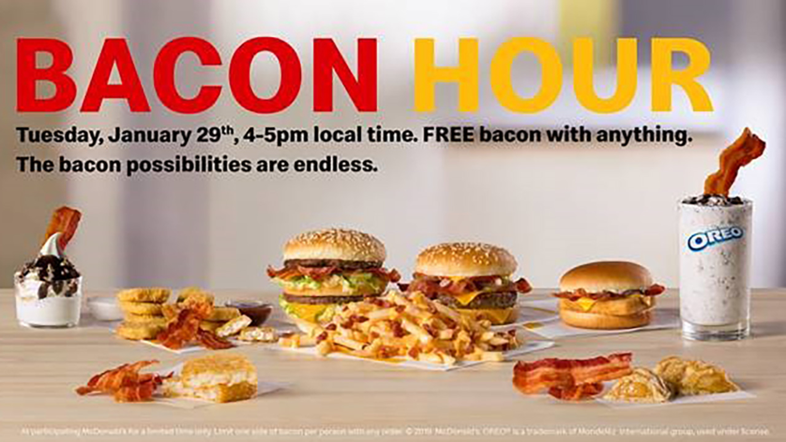 Customers can get free bacon on anything and everything at McDonald's, including hot fudge sundaes and the Filet O-Fish. Bacon Hour will take place from 4-5 p.m. next Tuesday, Jan. 29.