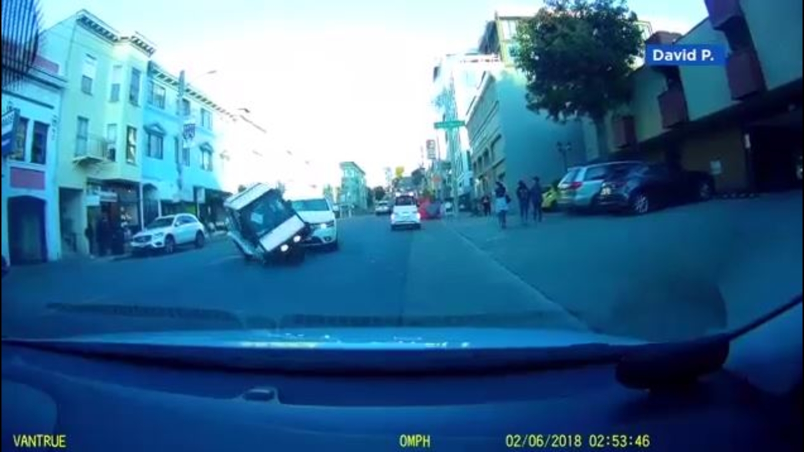 Uber dashcam video obtained by ABC7 News shows the parking control officer attempting to make a u-turn when a white van carrying the four suspects collides with the vehicle. The parking control officer's car flips onto its side and slides into a nearby car.