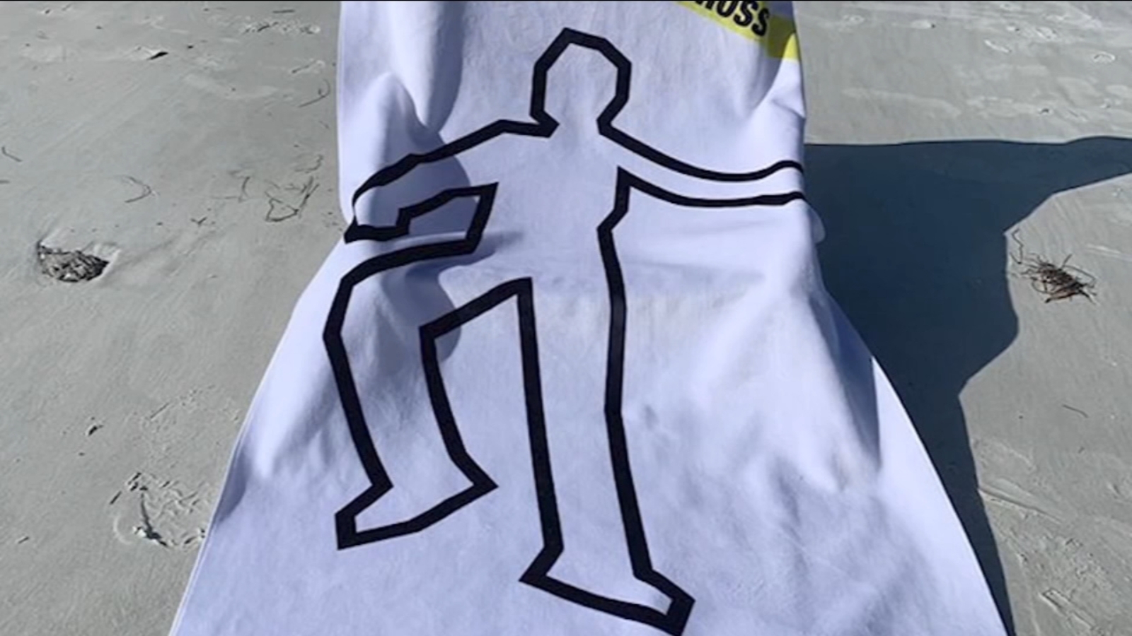 The towels show crime scene tape and an outline of what's supposed to portray a dead body. They're selling for $20 each.