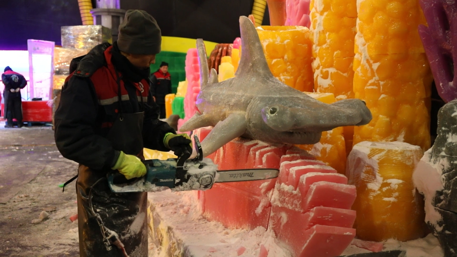 Carving all of the ice is a long process that can take around 40 days and a team from Harbin, China, uses chainsaws, chisels and ice picks to create intricate details.