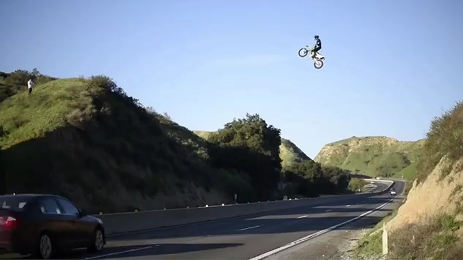 Authorities said the dangerous stunt happened in an area known as the Badlands, just east of Moreno Valley. Video of the motorcyclist jumping across all four lanes of the active freeway has since gone viral.