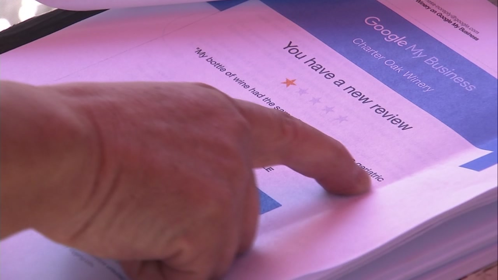 She points to another review she printed out to submit as evidence. "This one says my bottles of wine have the same finishing taste as..."