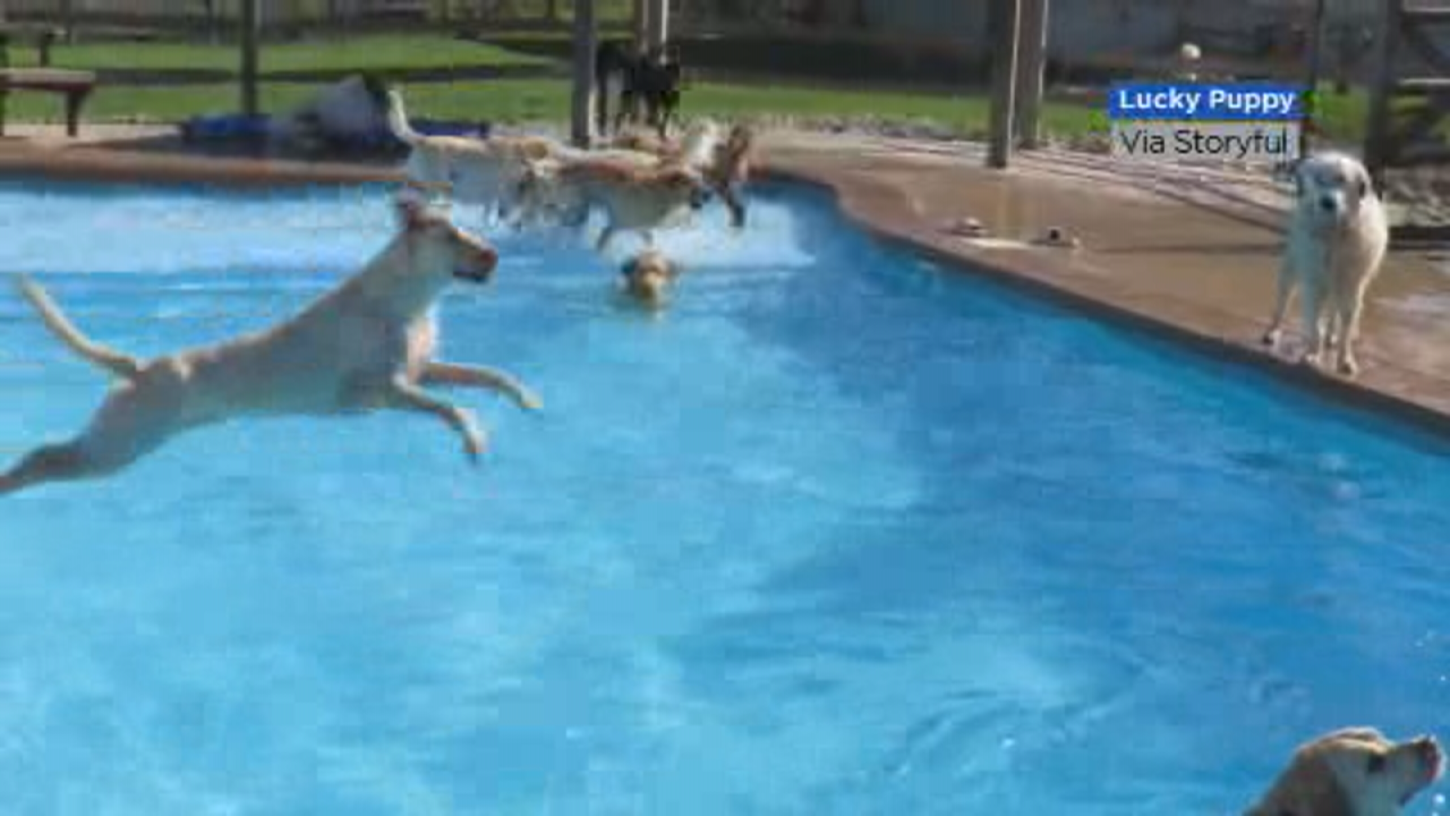 They are enjoying some time in the pool at a doggy daycare in Michigan.