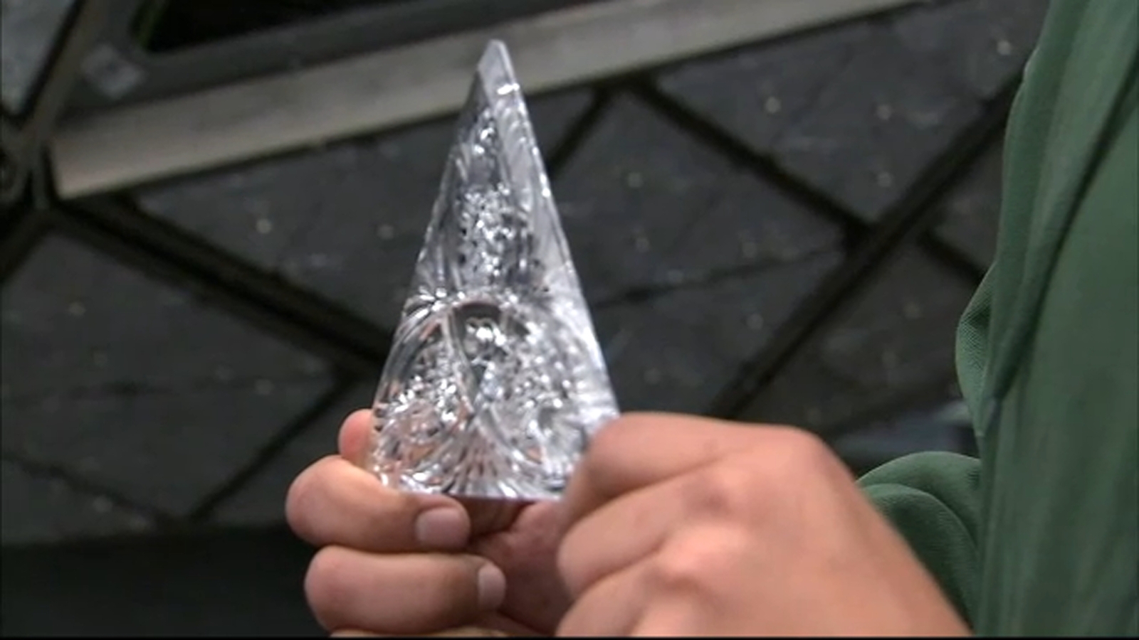 The Ball is covered with a total of 2,688 Waterford Crystal triangles that vary in size, and range in length from 4 3/4 inches to 5 3/4 inches per side.