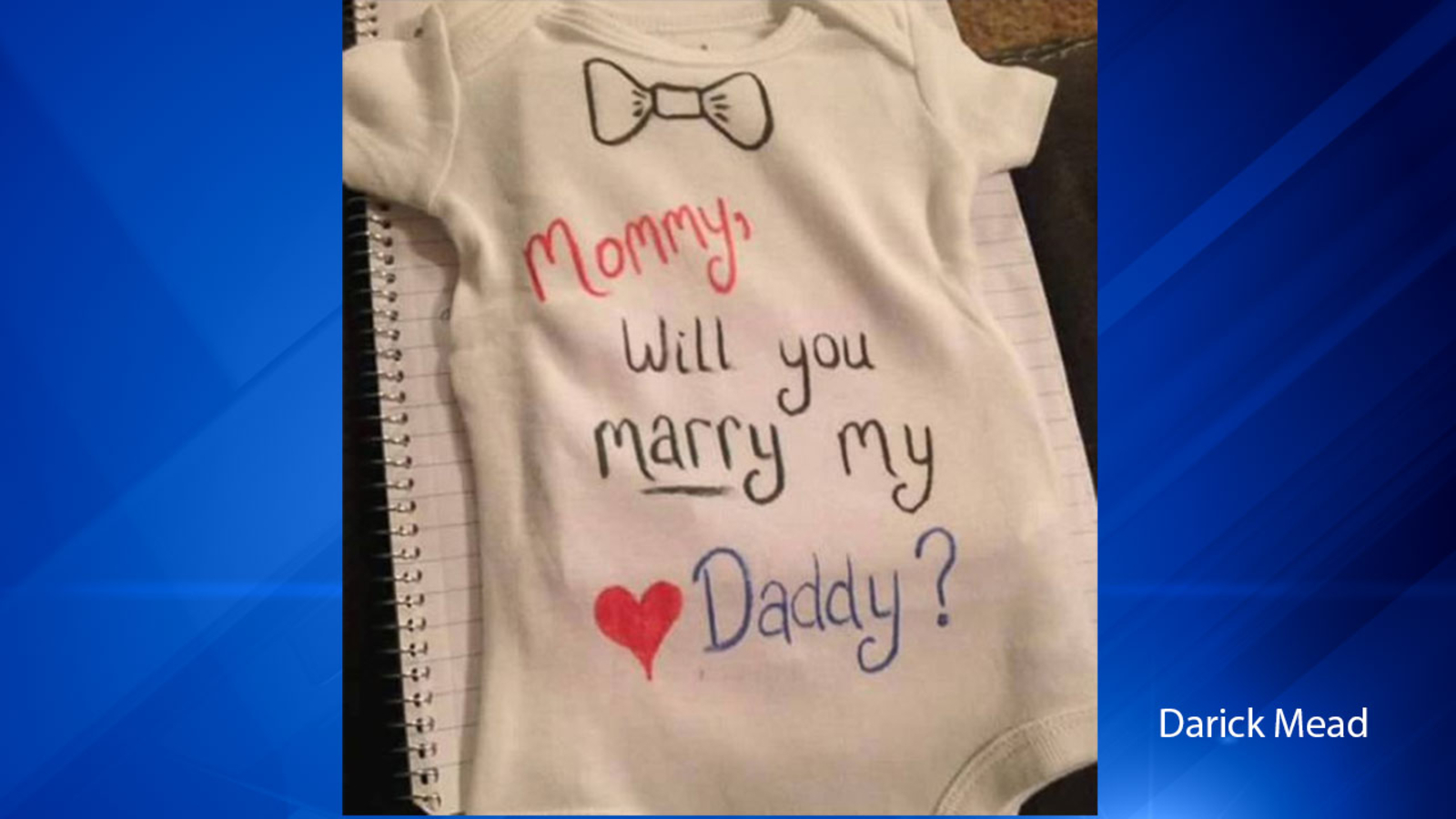Mead didn't tell anyone about his plans except the couple's friend Katie, who procured a onesie with the words, "Mommy, will you marry my daddy?"