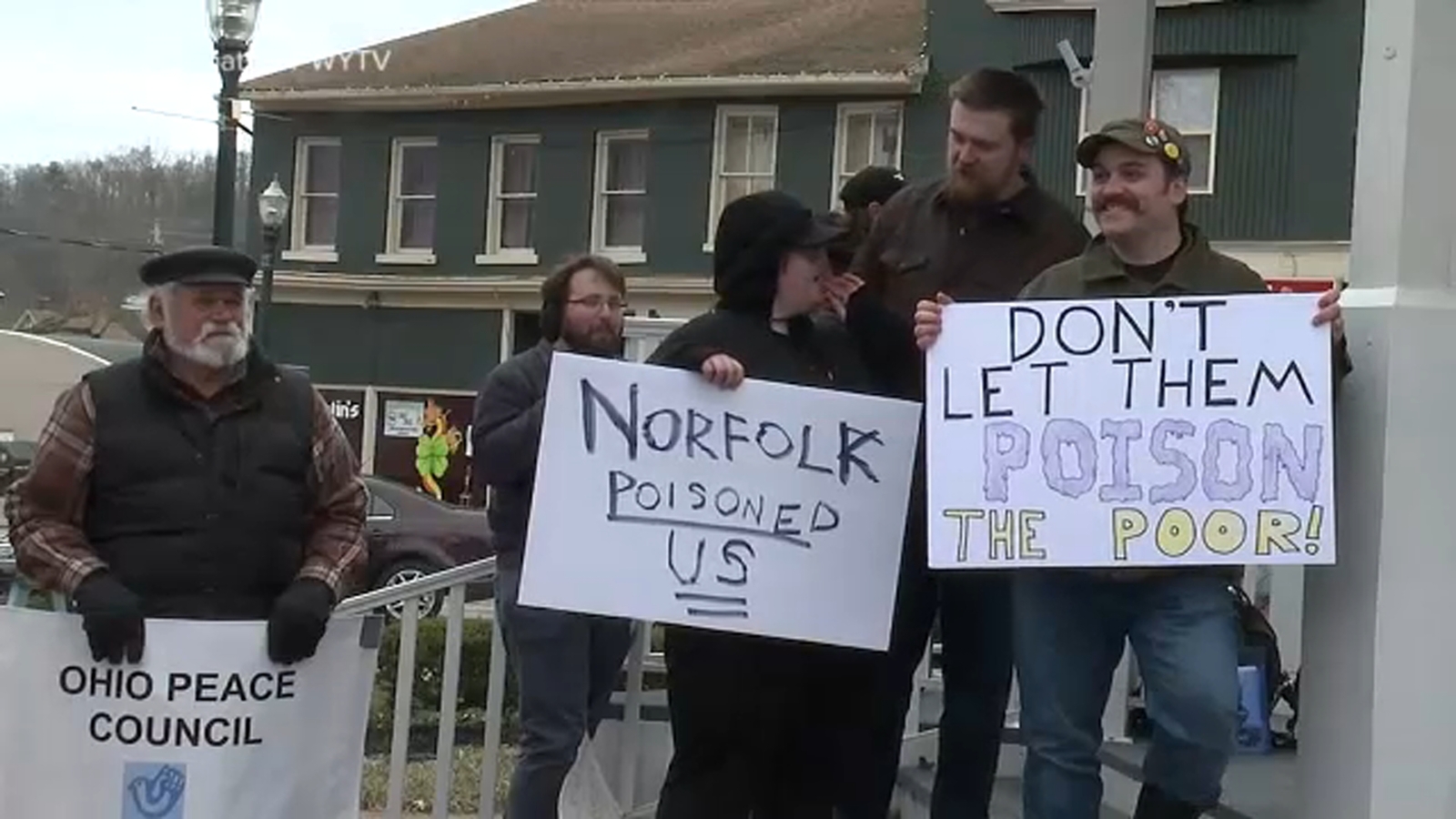 Saturday, residents just outside of East Palestine protested, holding up signs that read "Norfolk needs to pay."