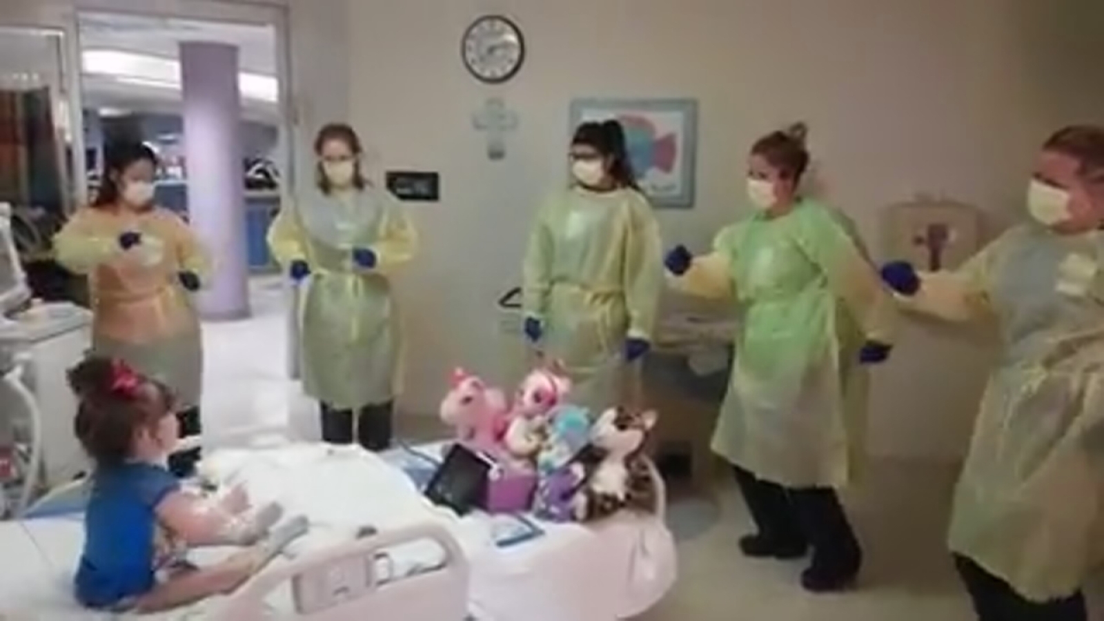 With several stuffed animals in attendance, Madison sat up in bed and danced along as five nurses surrounded her and shook it all about.