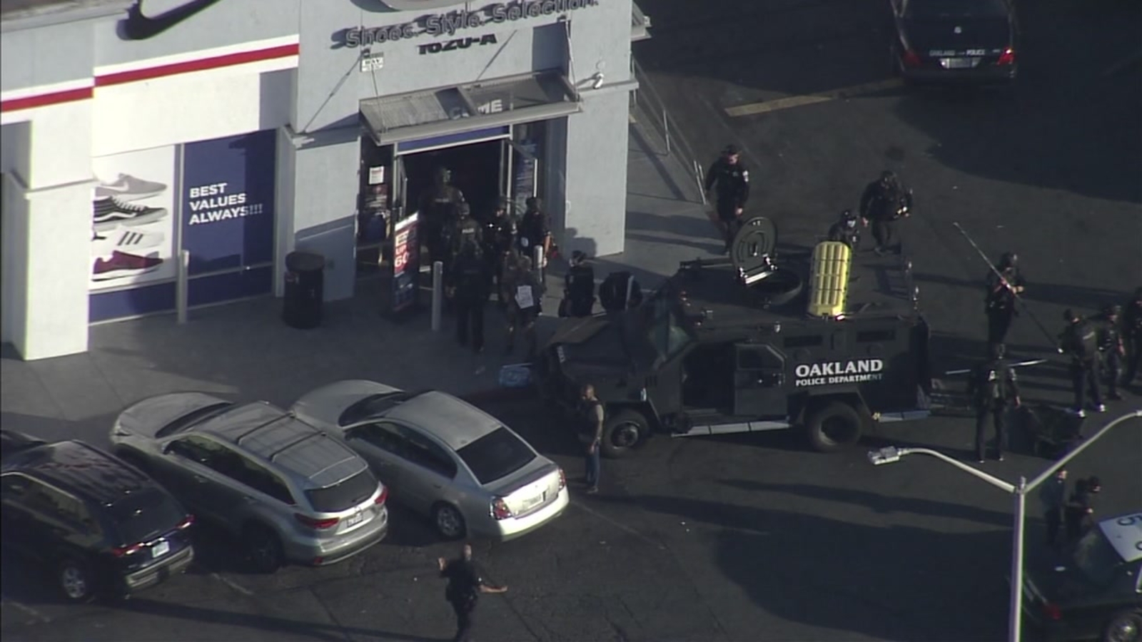 OAKLAND, Calif. (KGO) -- After a six hour standoff, Oakland Police arrested an armed gunman who had barricaded himself inside a shoe store in Fruitvale, taking one of the employees hostage.