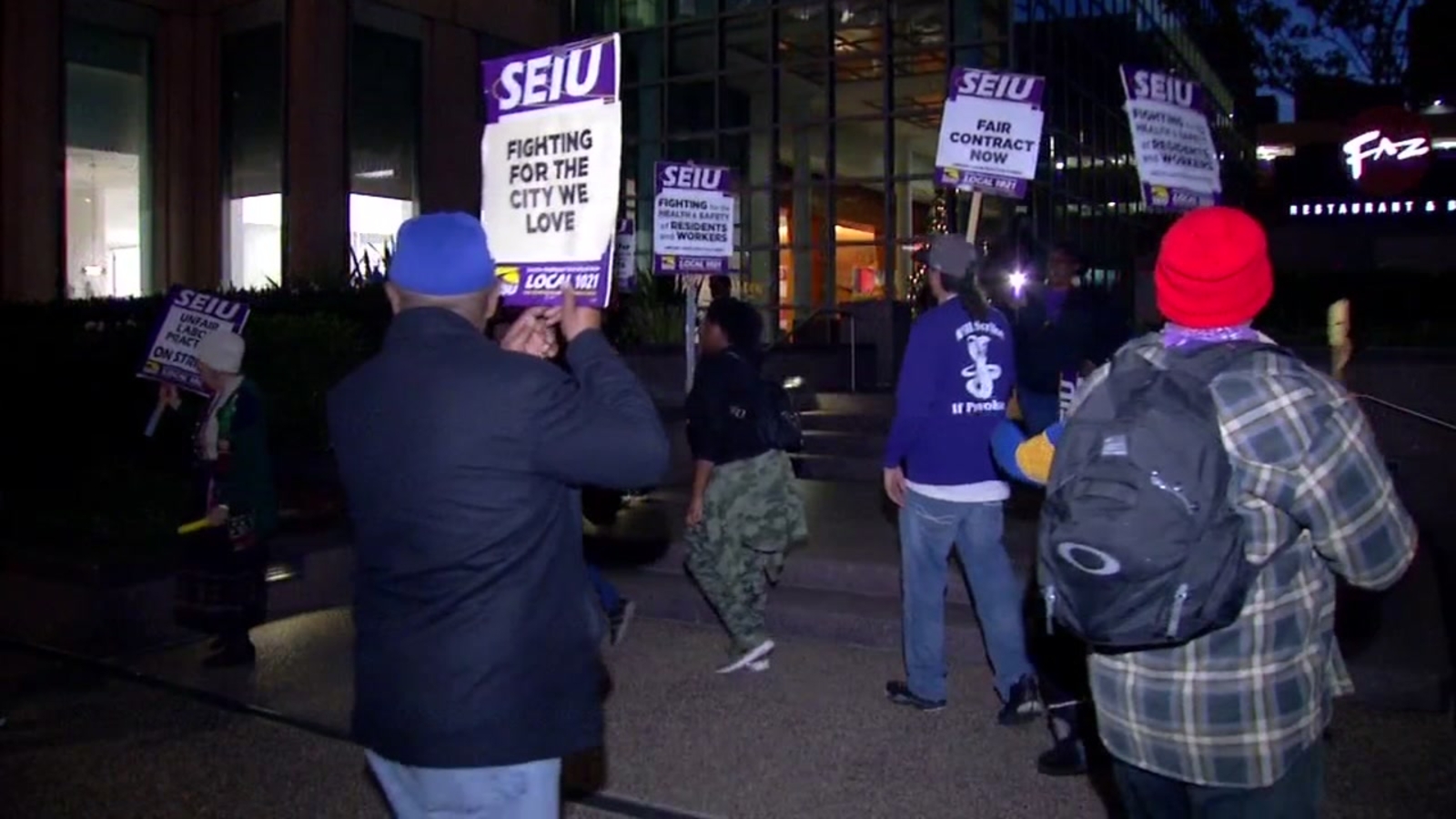 OAKLAND, Calif. (KGO) -- Striking Oakland city workers staged a picket line Tuesday outside a downtown law firm where Oakland Mayor Libby Schaaf was holding a fundraiser for the reelection campaign.