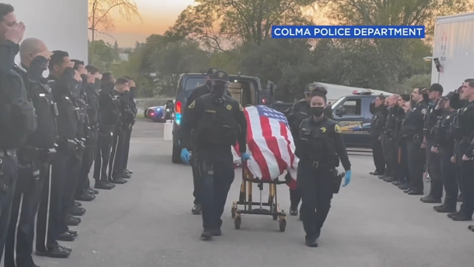 Saturday's video shows Kevin Nishita's casket draped in an American flag and wheeled to an Alameda County Coroner's van.