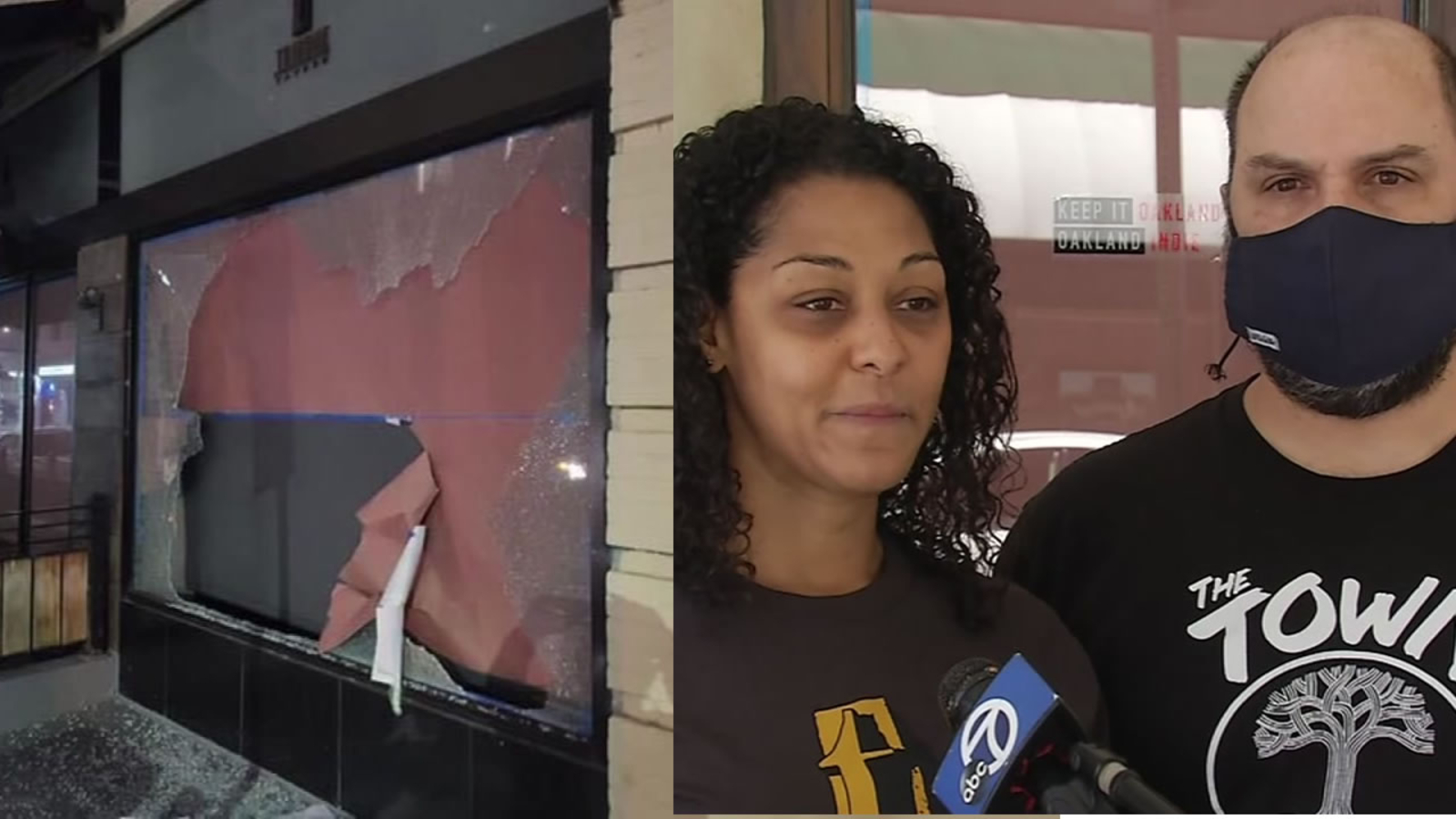 OAKLAND, Calif. (KGO) -- Tribune Tavern owners, Jana and Chris Pastena are picking up the pieces of broken glass and cleaning up the mess that took place inside their Oakland restaurant. Over the weekend looters stole electronic devices and alcohol.