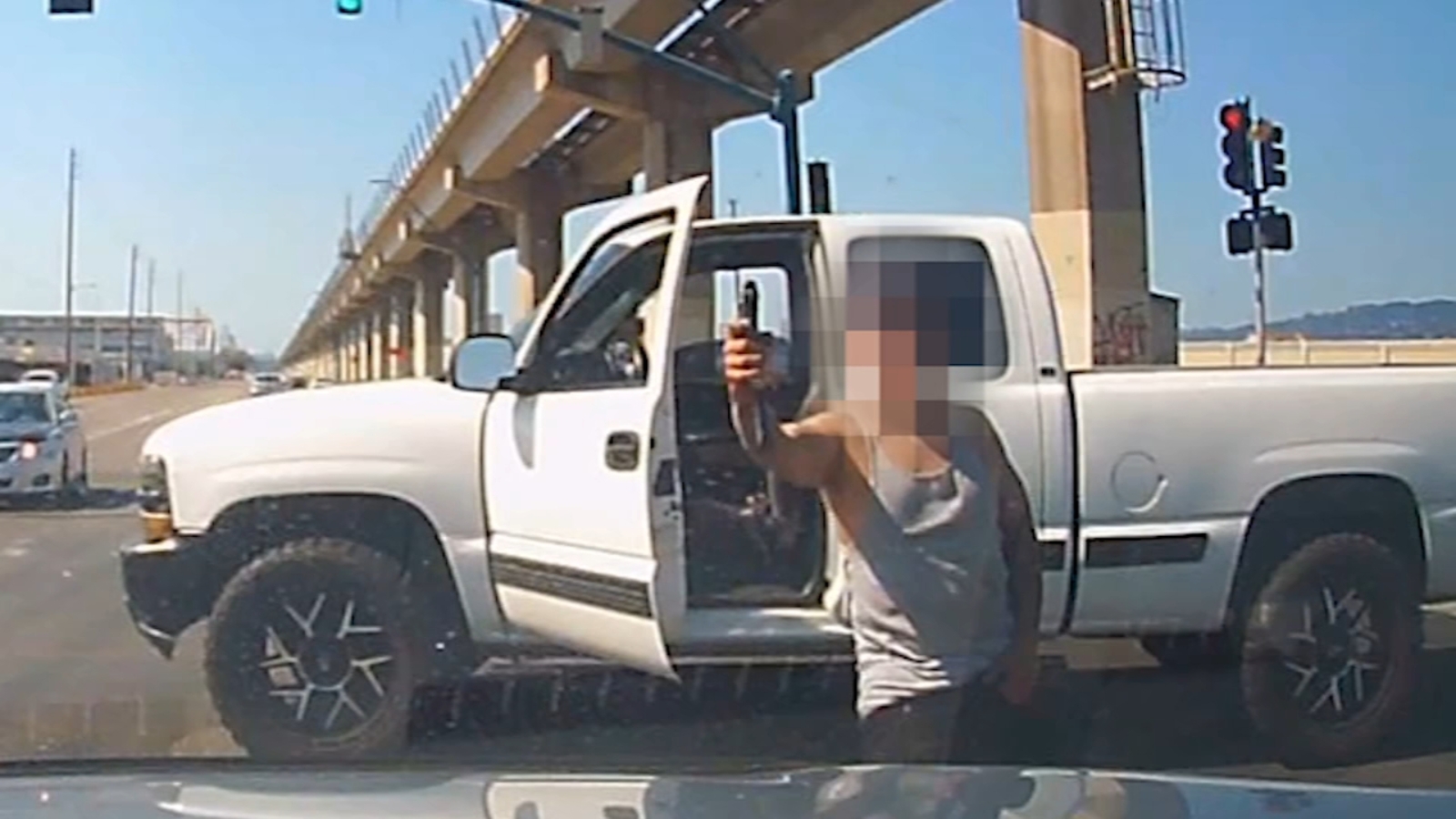 Dashcam video recorded in East Oakland shows a driver approaching the intersection of 98th and San Leandro Street. He has a green light but a man driving a white pickup truck goes through the red light and into the intersection. There is honking. The driver blocks the intersection and the man in that pickup gets out, points a gun at the other driver, and opens fire as the vehicle goes by -- something that left a bullet hole in the side of the vehicle.