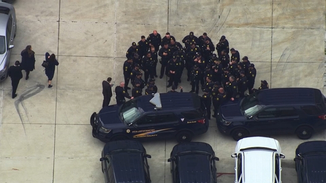 The massive police presence with Oakland officers and CHP officers spans several blocks.