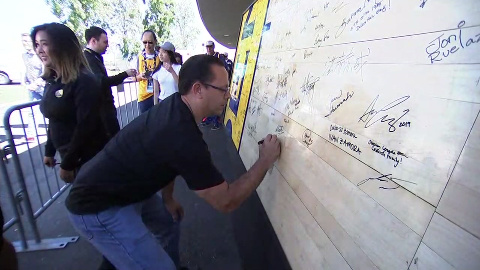 There was something special for fans Friday night-- a piece of the court to sign. The team is hoping they'll get around 20,000 signatures to commemorate the Warriors time here at Oracle.