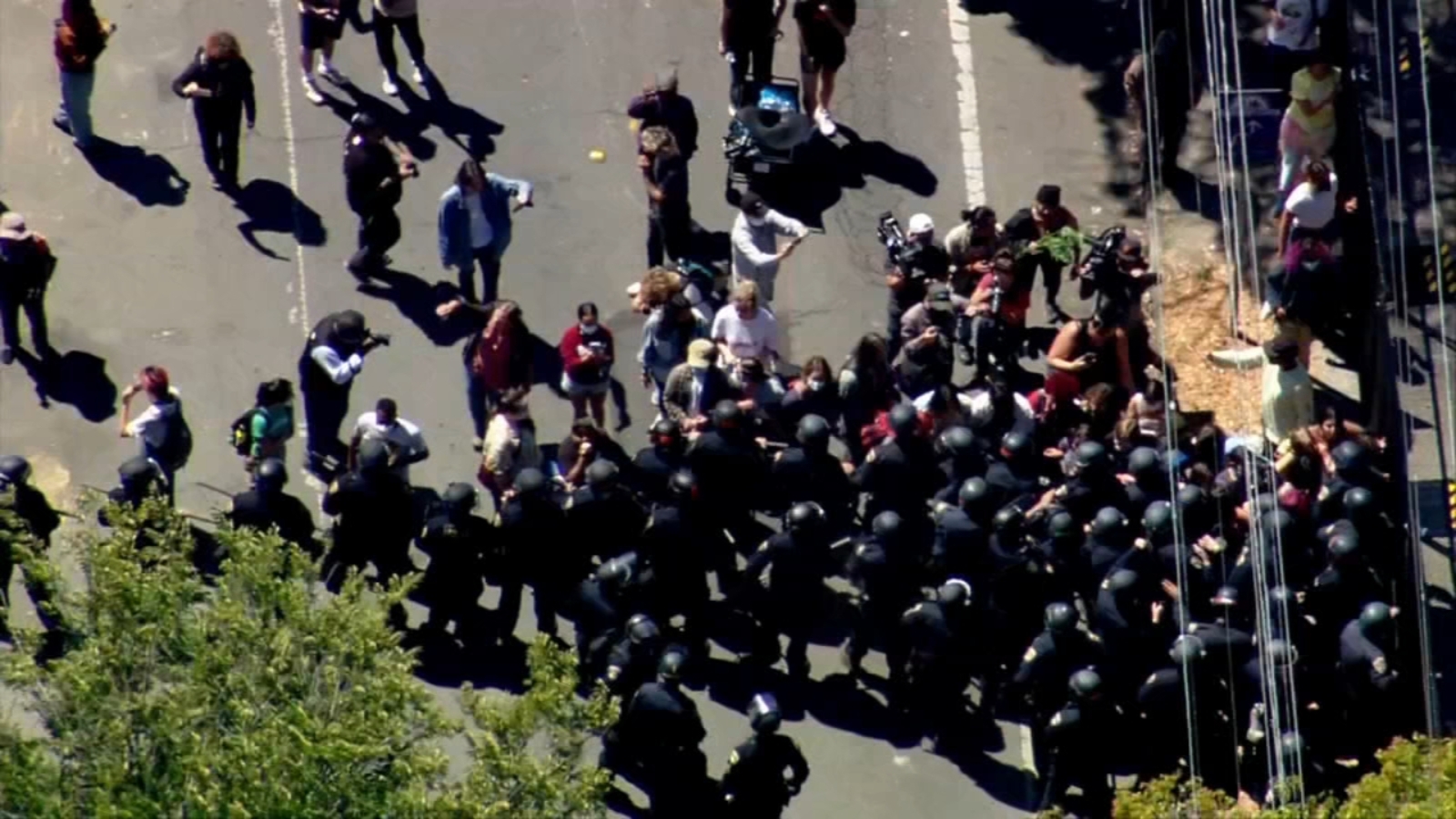 A large number of officers, most in riot gear, pushed back protesters, trying to prevent them from getting into the fenced-off People's Park.