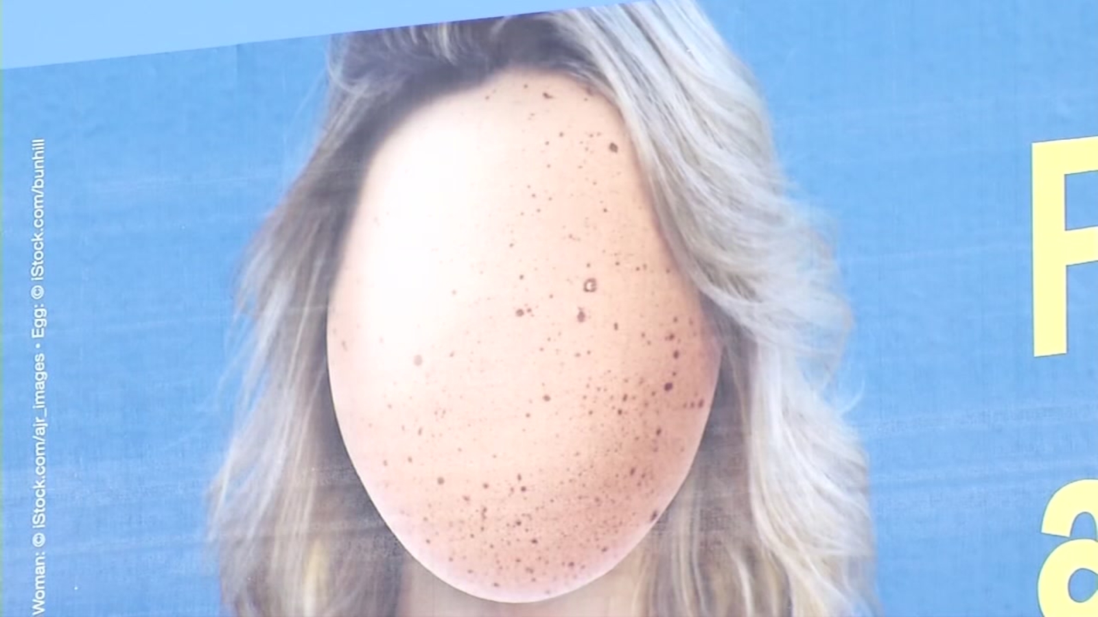 The controversial billboard recently went up at Oakland Road, near Highway 101 in San Jose. From a distance, people will notice a woman in a blue shirt, with blonde hair, and a bizarre egg face.