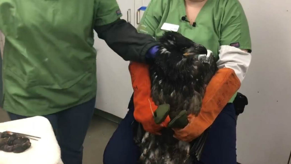 The vet called the eagle "Lucky." It's not known if the baby bald eagle is a boy or a girl. But a bruised wing was checked out by doctors after fish and game officials brought the raptor to Lindsay Wildlife Experience in Walnut Creek Monday evening. White bandages were on the top of its wings for protection.