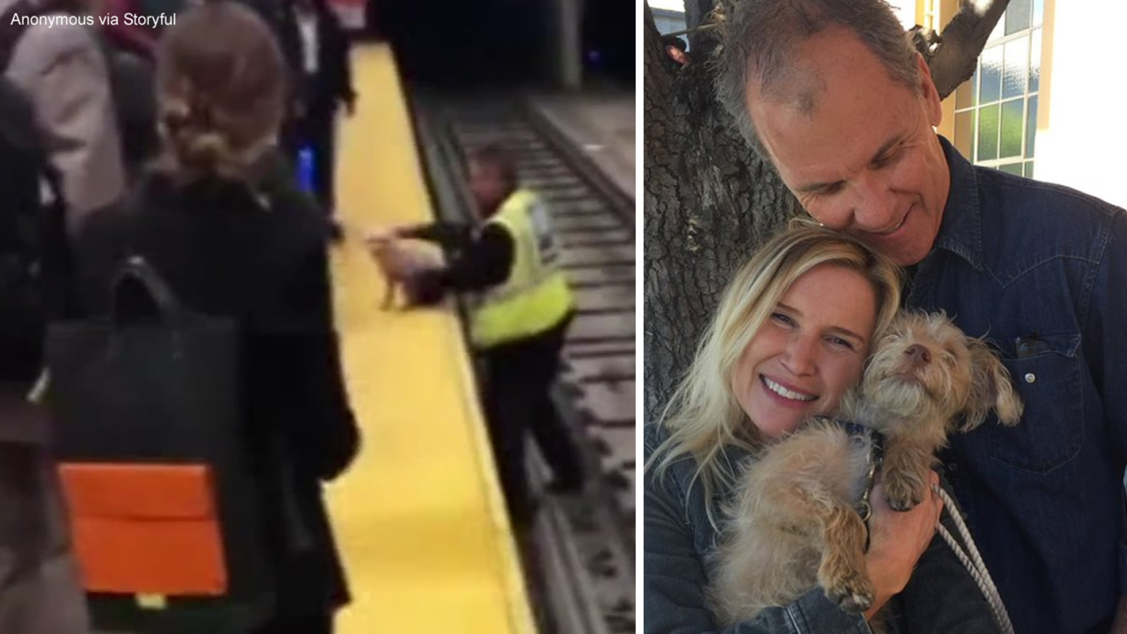 A commuter captured the exact moment when Kwong lifted Roofus from the tracks to safety on the platform.