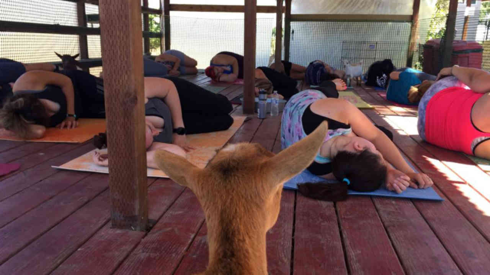 It's a yoga class on a wooden platform in the fields of Brentwood's First Generation Farms. And then they release the goats, six of them, to elevate this to a whole new level.