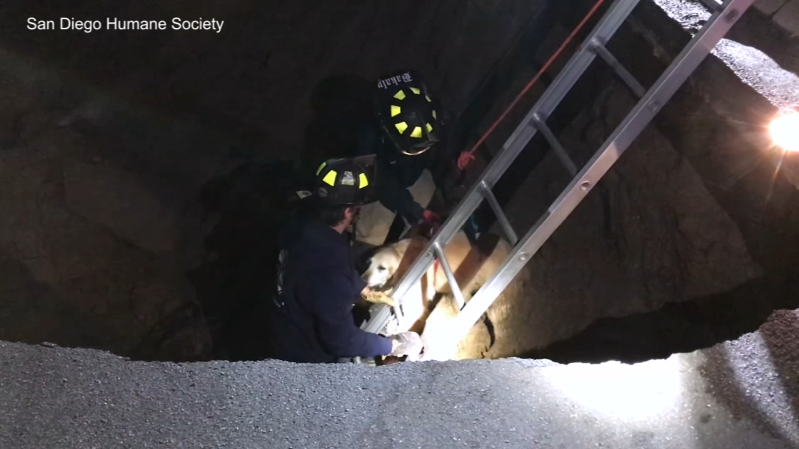 San Diego Humane Society's tech team was called in to assist the San Diego Fire Department with the rescue. Firefighters were able to safely remove Ruby from the sinkhole and reunited her with her owner.