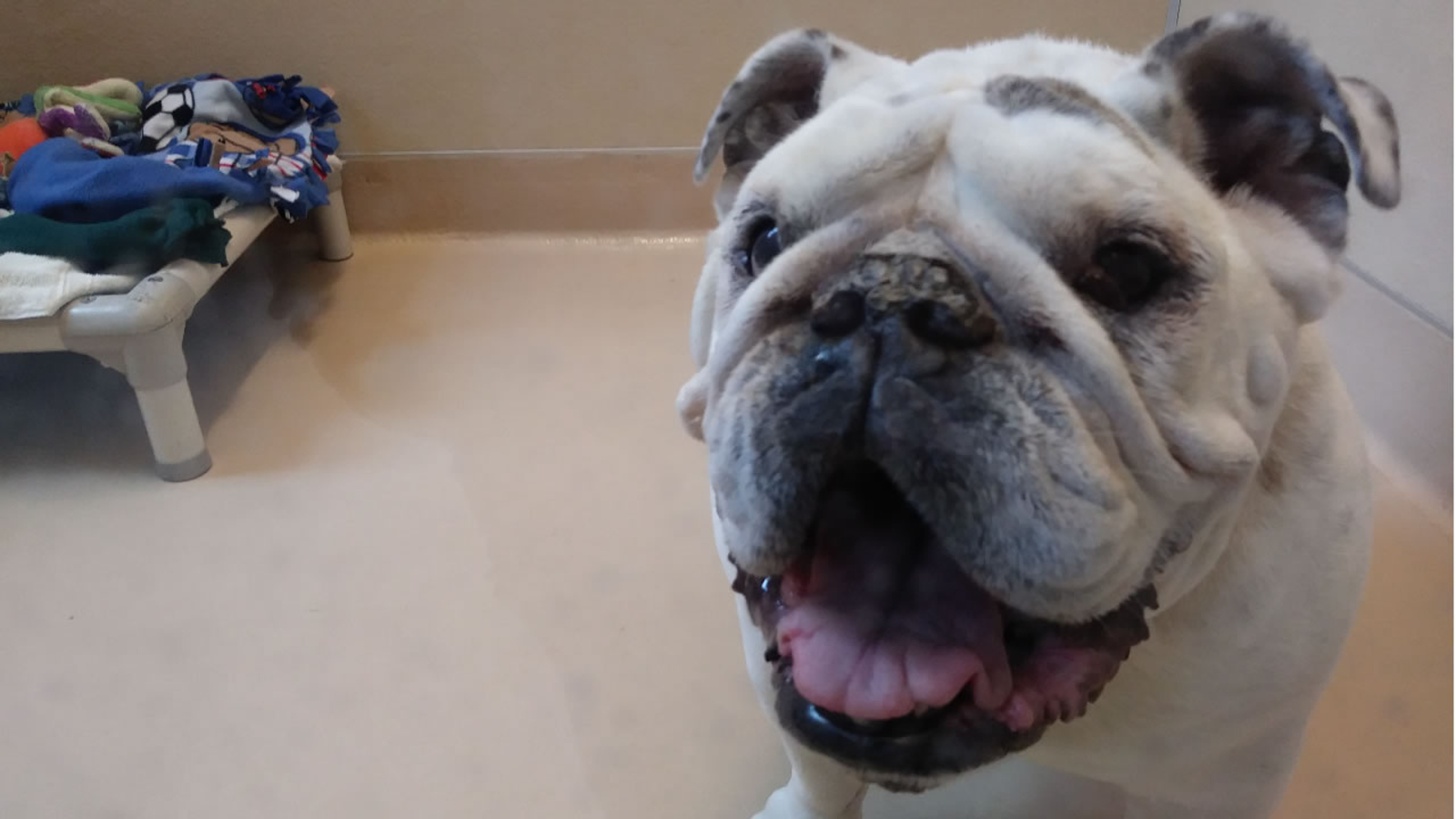 Beatrice has a number of ailments that animal rescue officials say makes it clear that the 2-year-old English bulldog mix has suffered a lack of care for some time. These ailments include everything from raging ear infections to toenails so long they wrap around her feet. In addition, she has terrible gingivitis, difficulty breathing, and a cherry eye which has turned black. She has ingrown eyelashes and has never been spayed, they say.