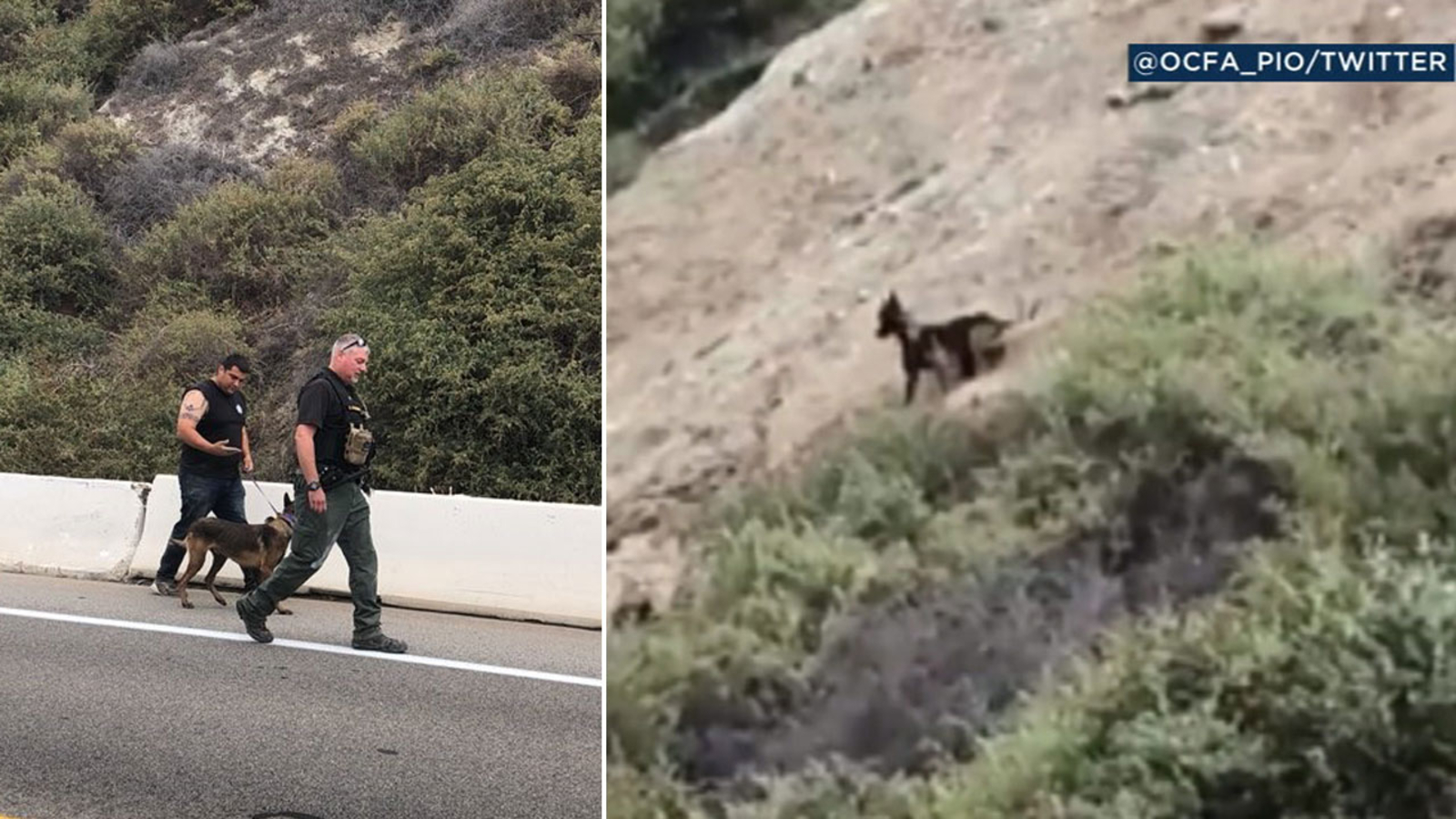 The Orange County Fire Authority was brought in at about 9 a.m. Friday to help the pup make it down.