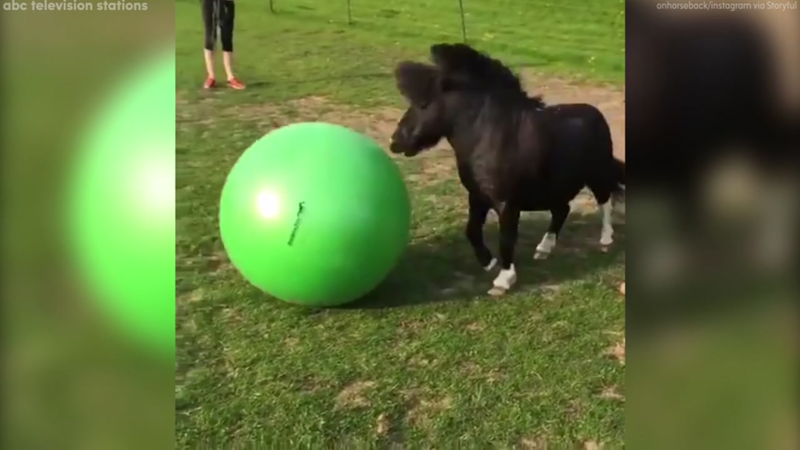 Basil the adorable miniature horse can't get enough of his favorite green yoga ball.