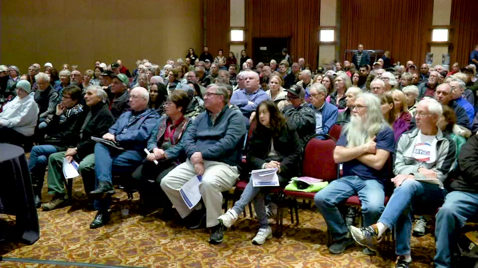 About 300 wildfire victims crowded into an auditorium at the Flamingo Hotel in Santa Rosa Sunday.