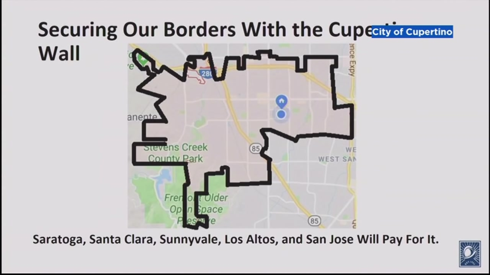 "You've heard about the wall along our southern border," said Cupertino Mayor Steven Scharf during his recent State of the City address, as he presented a picture of the city surrounded by a black border. "This is the wall around Cupertino. We have a big problem with all these Teslas coming through our city from Saratoga, and other people from other cities, so we came up with this proposal. San Jose will be mainly paying for it. It's not going to come out of our own taxes."