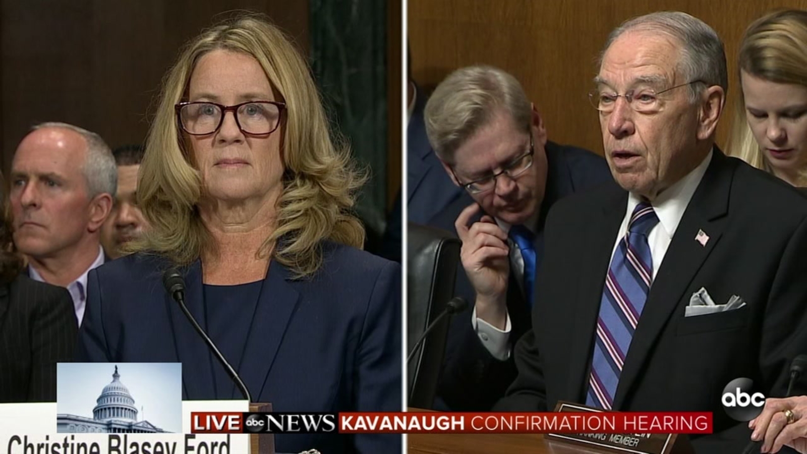 WASHINGTON (KGO) -- Judiciary Committee Chairman Chuck Grassley opened a hearing on sexual assault allegations against Supreme Court nominee Brett Kavanaugh with an apology to both Kavanaugh and his accuser for the way they've been treated, saying they and their families have received "vile threats."