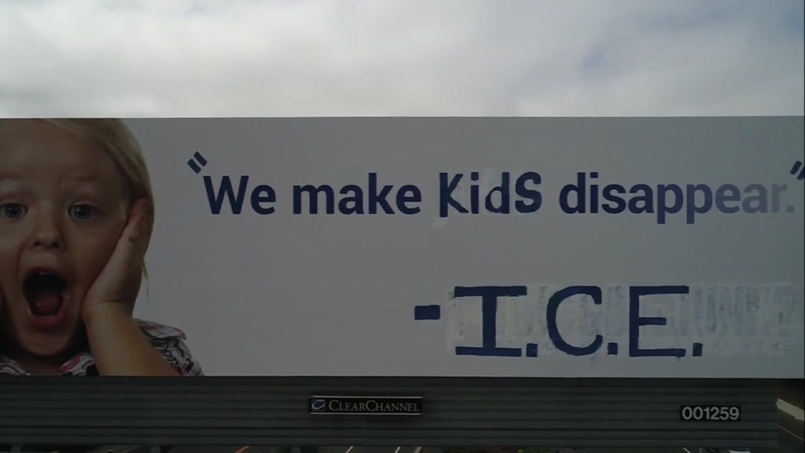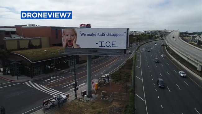 EMERYVILLE, Calif. (KGO) -- Drivers on Interstate 80 passing through Emeryville were doing a double take after a billboard for 1-800-GOT-JUNK was vandalized. The text was changed from "We make junk disappear" to "We make kids disappear - ICE."