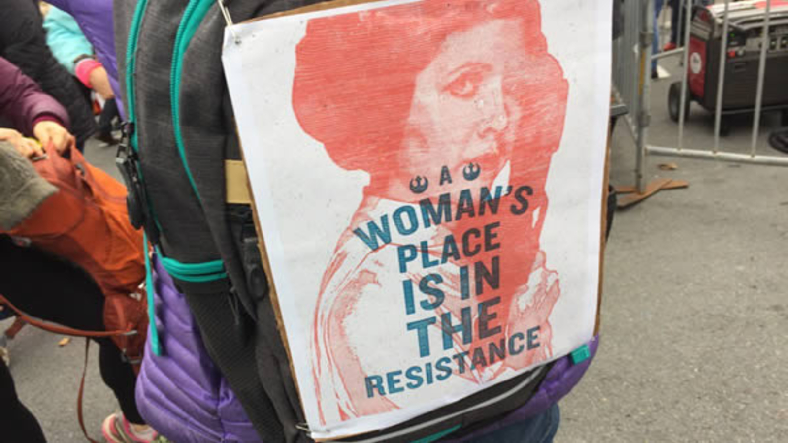 Kathleen wore a pink "pussy" knitted hat with cat eyes and whiskers on it. Many at the various Women's Marches taking place nationwide have sported similar hats, a reference to a 2005 video released during the presidential campaign in which Trump told an entertainment reporter about grabbing women by their genitals.