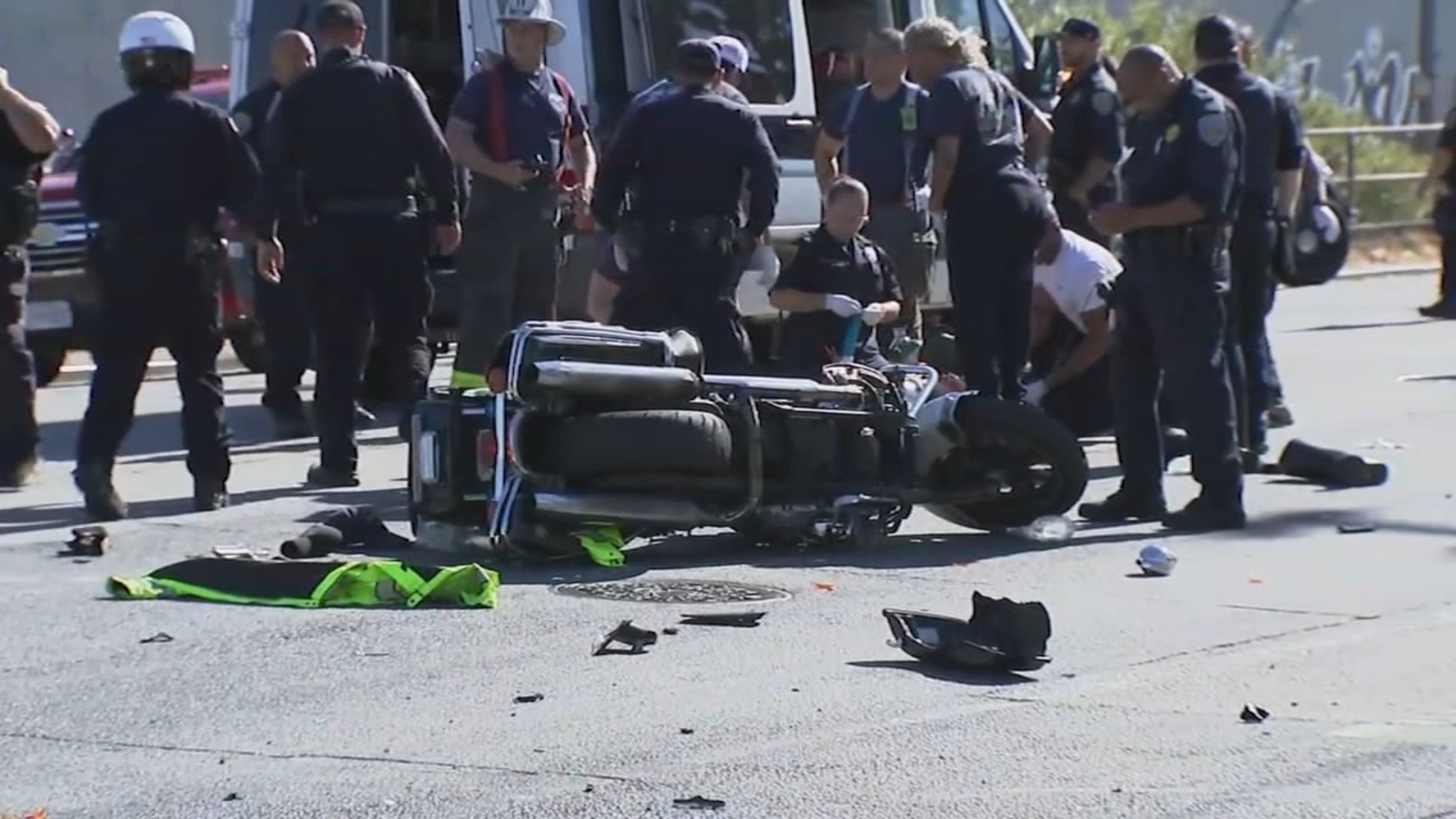 Video shows two San Francisco Police motorcycles down on the ground as emergency crews worked to help the two officers riding them.