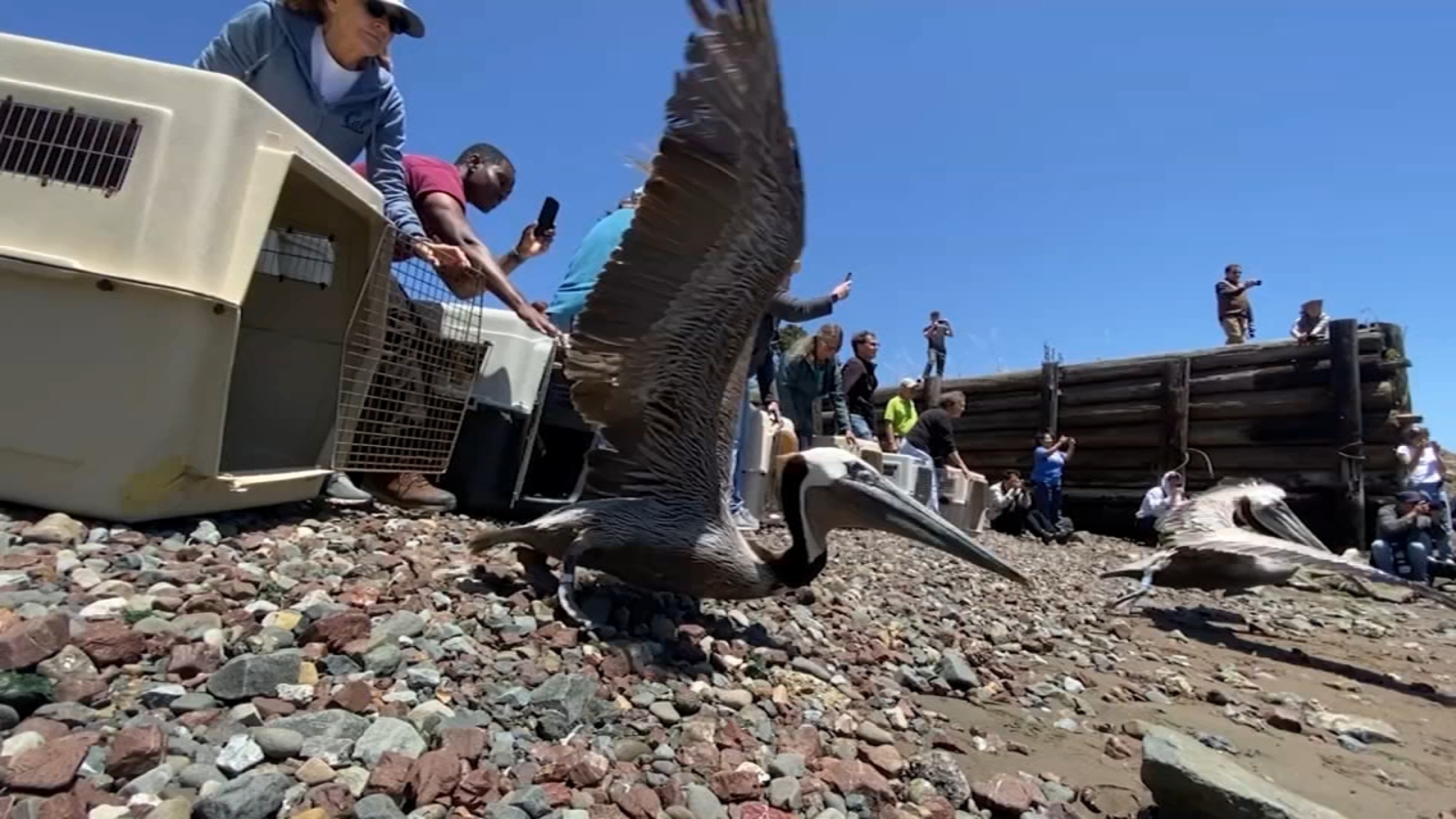 SAUSALITO, Calif. (KGO) -- In the North Bay, more healthy Brown pelicans were released into the wild, after hundreds of the sea bird were found starving on beaches along the California Coast this spring.