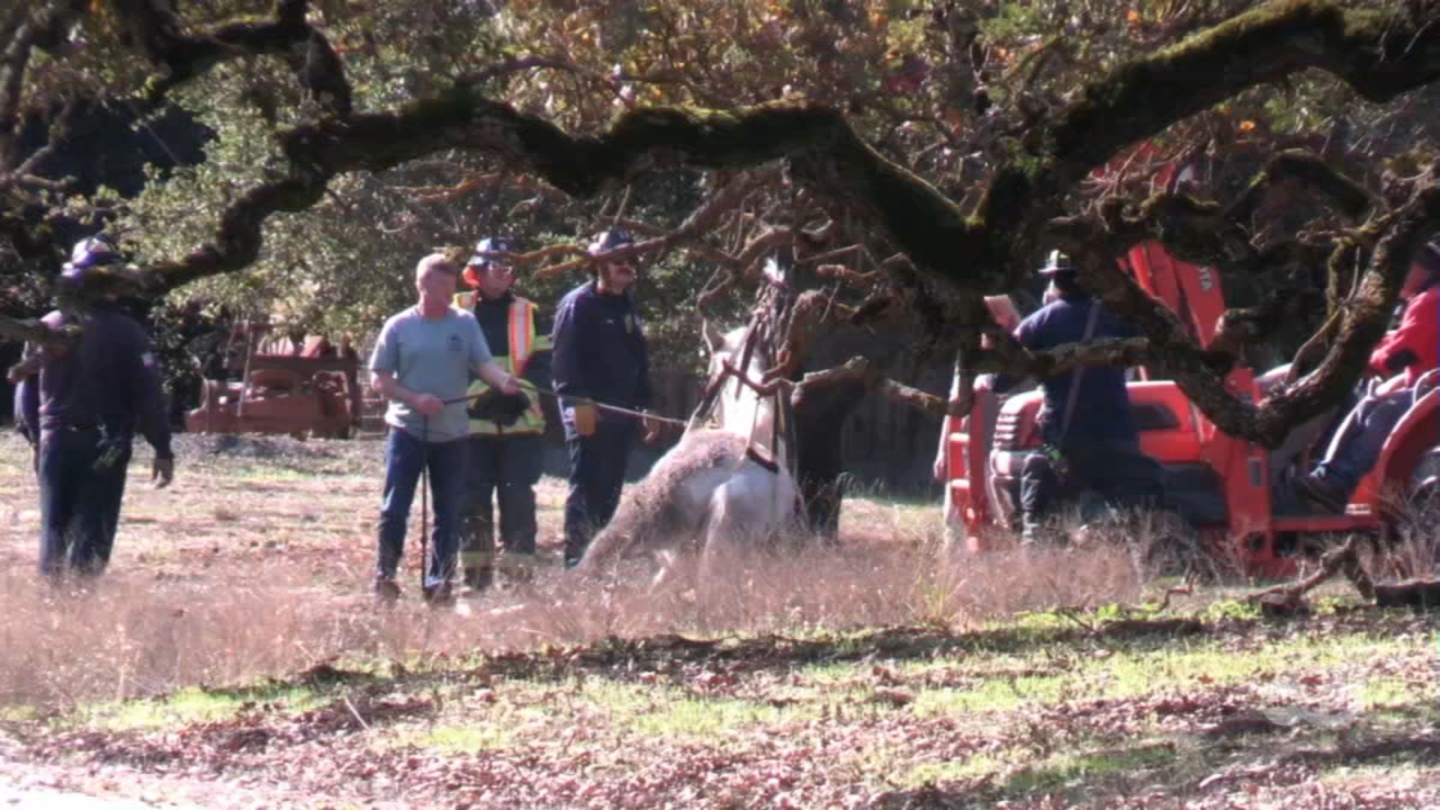An equine rescue team and firefighters used straps and a tractor to help the tired, weakened horse.
