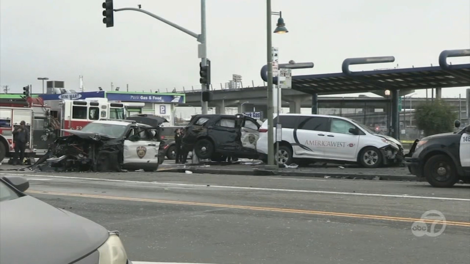OAKLAND, Calif. (KGO) -- Four people were hospitalized, including three police officers, following a multiple-vehicle crash involving two BART police cars and a medical supply vehicle that blocked the intersection of Mandela Parkway near the West Oakland BART station late Saturday afternoon.