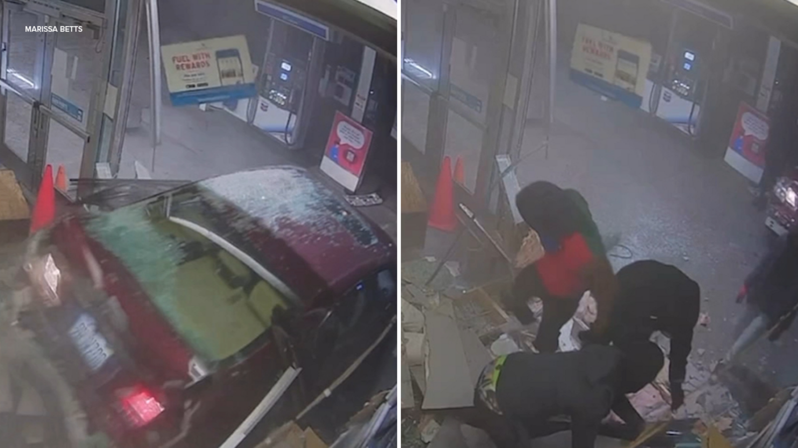Surveillance video shows a red car ramming the front window of the convenience store, where the cash register is, and then a group of people rummaging through the debris.